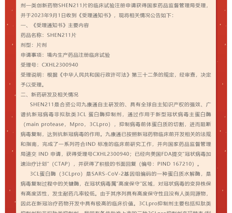 一类创新药SHEN211片临床试验注册申请获得受理